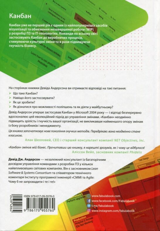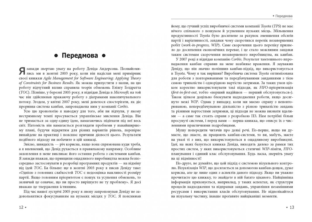 Ось він, той самий таємничий Канбан! Девід Андерсон, один із батьків запровадження цієї системи у сферу розробки ПЗ та ІТ-технологій, розповів у своїй книжці про теоретичне підґрунтя Канбан і його глибокий вплив на скорочення обсягів невиконаної роботи, підтримання постійного робочого потоку, боротьбу з варіативністю, а головне — про створення нової корпоративної культури, заснованої на принципах «кайдзен».