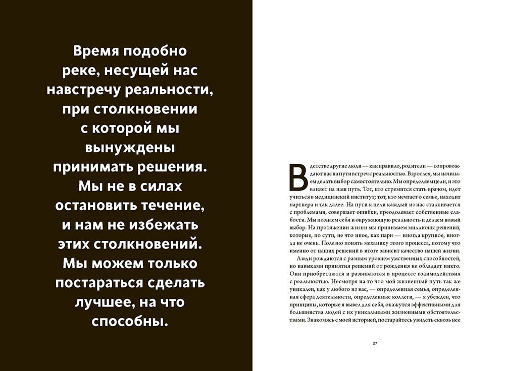 Рэй Далио входит в список 100 самых влиятельных людей планеты (по версии Time) и 100 самых богатых людей в мире (по версии Forbes). Рэй Далио считает, что добился успеха не потому что он особенный, а потому что его успех стал результатом применения принципов, которые он сформулировал, зачастую учась на своих ошибках. И эти принципы могут быть полезны большинству людей.