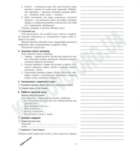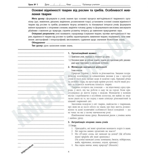 Посібник містить шаблони планів-конспектів усіх уроків із біології для 7 класу за Новою програмою до будь-якого чинного підручника Біологія 7 клас Нова програма. За їх допомогою можна швидко скласти власну розробку уроку та здати її на перевірку До посібника додається скретч-картка для завантаження додатків, що містять додаткові матеріали до уроків, роздавальні матеріали для учнів, календарний план, такі самі плани-конспекти уроків, як і в посібнику. Кожен із цих компонентів можна відредагувати в редакторі Word та роздрукувати. Призначений для вчителів біології.