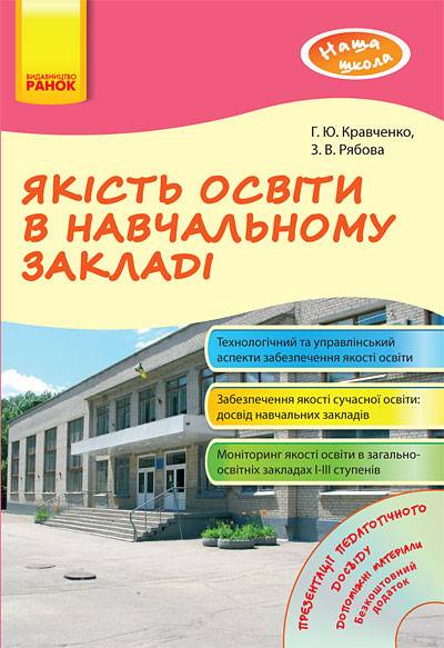 Наша школа Якість освіти в навчальному закладі + CD Кравченко Г. Ранок. Науково-методичний посібник висвітлює теоретичні та методологічні аспекти, поняття «управління якістю освіти», його складові; визначаються особливості та специфіка реалізації моніторингу якості загальної середньої освіти; механізм розробки нових цілей, змісту, форм і методів управління якістю освіти в умовах науково-методичної роботи загальноосвітніх навчальних закладів.