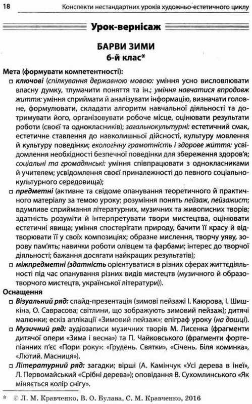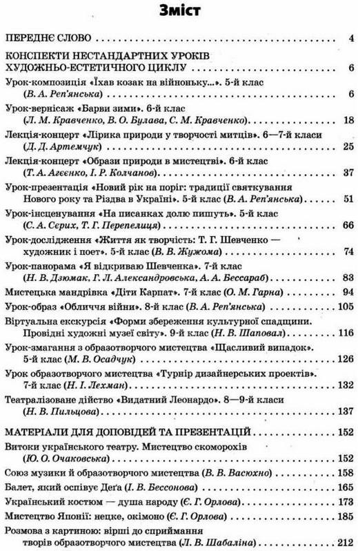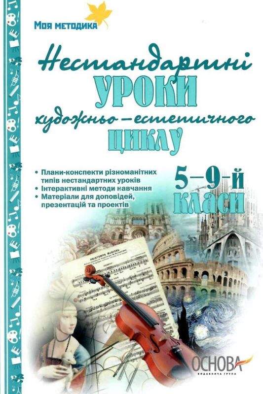 Нестандартні інтегровані уроки художньо-естетичного циклу в школі 5-9-й класи Є. Орлова Основа. Видання містить розробки нестандартних (здебільшого інтегрованих) уроків художньо-естетичного циклу для 5—9-х класів загальноосвітніх шкіл, а також змістовну добірку цікавих матеріалів для підготовки доповідей, презентацій та творчо-дослідницьких проектів.