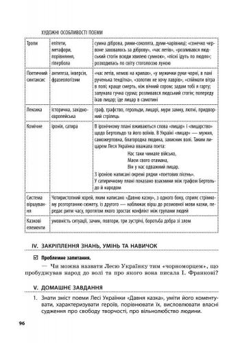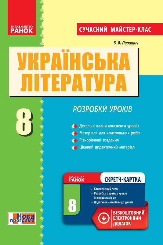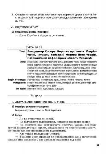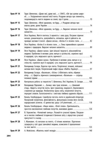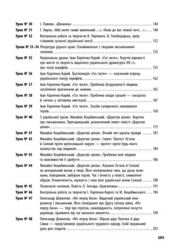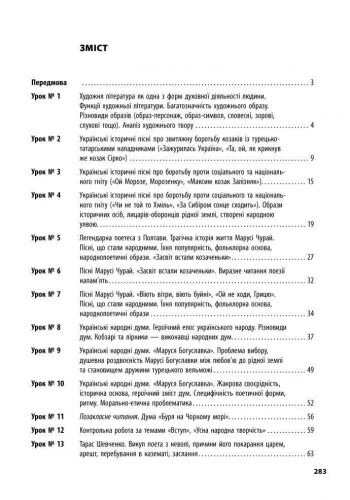 Посібник укладено відповідно до чинної програми. Він містить 70 уроків з української літератури: звичайних і нетрадиційних, формування вмінь і навичок, контролю й корекції знань та ін. Майже до кожного уроку автор надає додатковий матеріал, що забезпечує вчителя докладними біографіями письменників, історичними, етнографічними довідками тощо. До посібника додається скретч-картка для завантаження безкоштовного електронного додатка: календарного плану, розробок уроків із презентаціями та додаткових матеріалів до уроків.