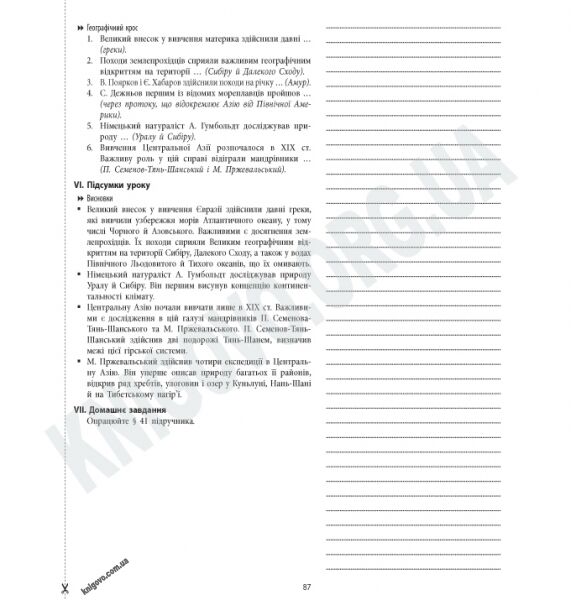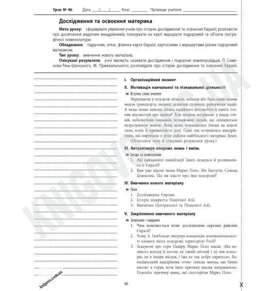 Посібник містить шаблони планів-конспектів усіх уроків з географії для 7 класу, складені за Новою програмою та адаптовані до будь-якого чинного підручника «Географія 7 клас» (Нова програма). Матеріали видання розроблені таким чином, щоб максимально полегшити роботу вчителя та допомогти ефективно організувати навчальний процес, забезпечуючи систематичне і послідовне засвоєння навчального матеріалу учнями.