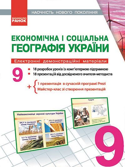 Серія дисків видавництва "Ранок" - "Наочність нового покоління" - спеціально для тих, хто цінує свій час та прагне до вдосконалення! Наші диски стануть Вашим незамінним помічником при підготовці та проведенні уроків. Диск містить: - 18 розробок уроків із комп'ютерною підтримкою; - 18 анімованих мультимедійних презентацій від досвідченого вчителя-методиста - 1 презентацію нового формату в сучасній програмі Prezi; - Розробку уроку до кожної з презентацій у форматі doc; - Календарно-тематичний план до курсу "Економічна і соціальна географія України. 9 клас"; - Майстер-клас "Правила створення презентацій" (відеофільм)