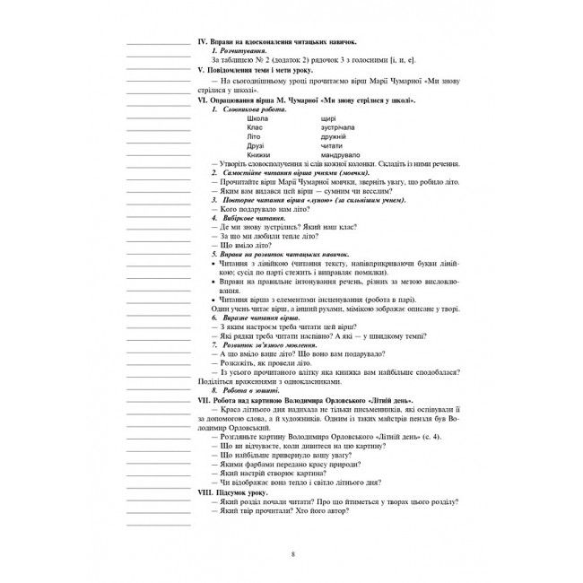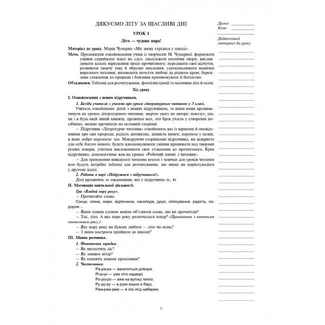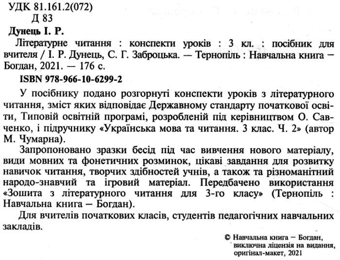 Літературне читання 3 клас Конспекти уроків Посібник для вчителя до підручника Чумарної М. НУШ Богдан. У посібнику подано розгорнуті конспекти уроків з літературного читання, зміст яких відповідає Державному стандарту початкової освіти, Типовій освітній програмі, розробленій під керівництвом О. Савченко, і підручнику «Українська мова та читання. 3 клас. Ч. 2» (автор М. Чумарна). Запропоновано зразки бесід під час вивчення нового матеріалу, види мовних та фонетичних розминок, цікаві завдання для розвитку навичок читання, творчих здібностей учнів та різноманітний народознавчий та ігровий матеріал. Передбачено використання «Зошита з літературного читання для 3-го класу» (Тернопіль : Навчальна книга – Богдан). Для вчителів початкових класів, студентів педагогічних навчальних закладів.