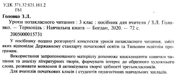 Уроки позакласного читання 3 клас Посібник для вчителя Оновлене Коло читання НУШ Головко З. Богдан. У посібнику подано розгорнуті конспекти уроків позакласного читання, зміст яких відповідає Державному стандарту початкової освіти та Типовим освітнім програмам. Використання запропонованого матеріалу допоможе вдосконалити навички читання та аналізу літературних творів, формувати інтерес до образного художнього слова, розвивати мовлення й активізувати творчі здібності третьокласників. Для вчителів початкових класів і студентів педагогічних навчальних закладів.