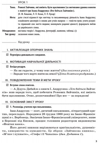 У посібнику наведено розробки уроків літературного читання різних типів, запропоновано різноманітні форми та методи роботи з учнями.