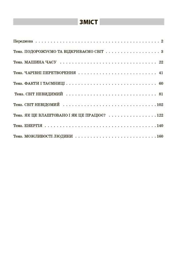 Посібник містить дев’ять тематичних модулів, за якими відбувається весь навчальний процес у 4-му класі НУШ: «Подорожуємо та відкриваємо світ», «Машина часу», «Чарівні перетворення», «Факти і таємниці», «Світ невидимий», «Світ невідомий», «Як це влаштовано і як це працює?», «Енергія», «Можливості людини».