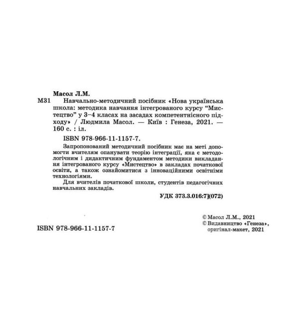 Методика навчання інтегрованого курсу Мистецтво у 3-4 класах НУШ ЗЗСО на засадах компетентнісного підходу. Навчально-методичний посібник Масол Л. Генеза. Нова українська школа.