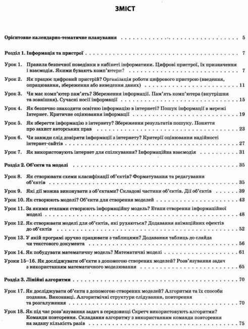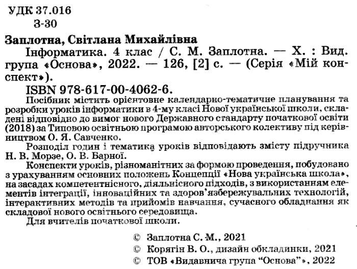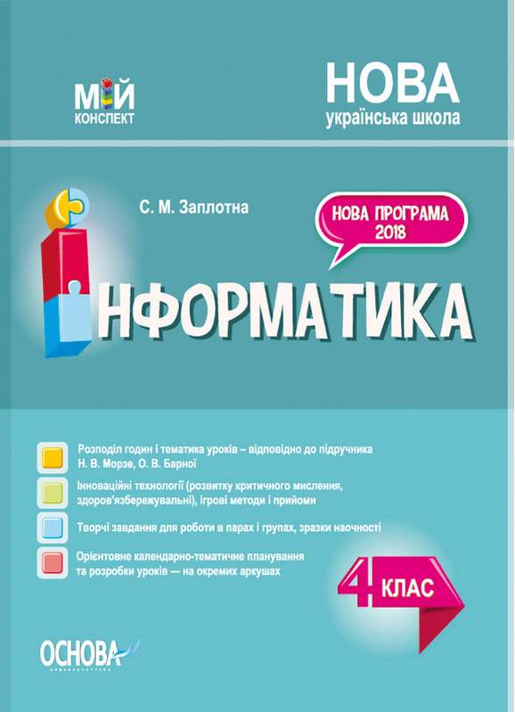 Мій конспект Інформатика 4 клас За підручником Морзе Н. НУШ Заплотна С. Основа. Посібник містить орієнтовне календарно-тематичне планування та розробки уроків інформатики у 4-му класі Нової української школи, складені відповідно до вимог нового Державного стандарту початкової освіти (2018) за Типовою програмою авторського колективу під керівництвом О. Я. Савченко.