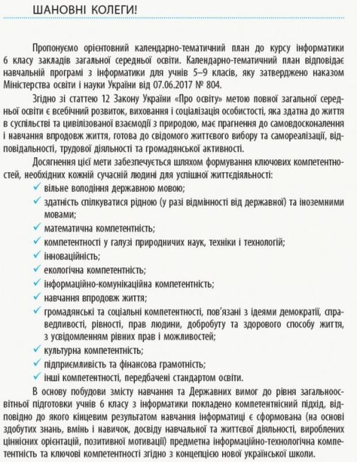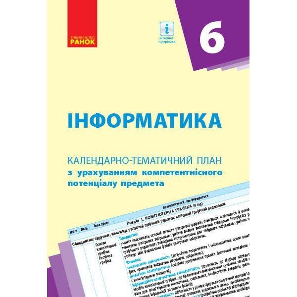 Календарно-тематичний план Інформатика 6 клас Рівень стандарту Ранок. Запропонований календарно-тематичний план розроблено відповідно до навчальної програми з інформатики для 6 класу з урахуванням провідних ідей особистісно орієнтованого і компетентнісного підходів у навчанні.