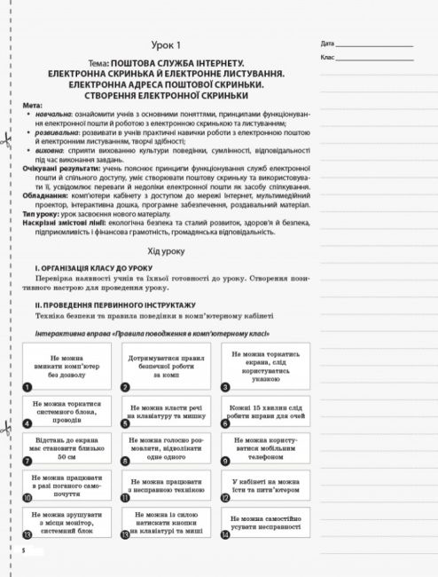 Кожен конспект уроку побудований відповідно до вимог сучасної педагогіки та містить чітко сформульовану навчальну мету, перелік необхідного обладнання, очікувані результати навчання, а також основні поняття та наскрізні змістові лінії. Така структура допомагає вчителеві легко орієнтуватися у матеріалі та грамотно планувати освітній процес.