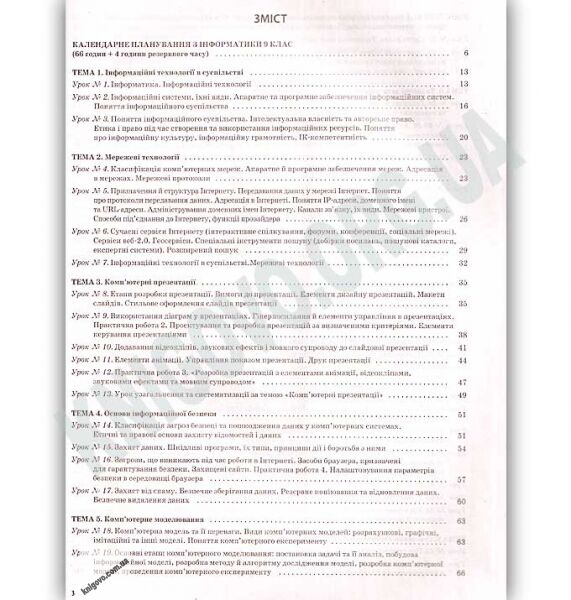 Містить конспекти усіх уроків курсу інформатики для 9-го класу, розроблені з урахуванням базових підходів особистісно орієнтованої технології навчання. До змісту конспектів уроків входять практичні роботи та компетентнісні завдання різних рівнів складності. Кожен конспект має методично грамотно сформульовані мету, тип, цілі уроку, необхідне обладнання та очікувані результати. Передбачається, що розробки уроків, у разі необхідності, можуть бути авторські доповнені вчителем, для чого відведено спеціальне місце для записів. Запропоновані форми роботи, види та зміст завдань значно полегшать підготовку вчителя до уроків та звільнять час для власної творчості. Складено відповідно до Програми курсу Інформатика 5-9 класи для загальноосвітніх навчальних закладів, що розрахована на учнів, які до 5 класу не вивчали інформатику.