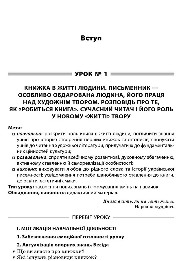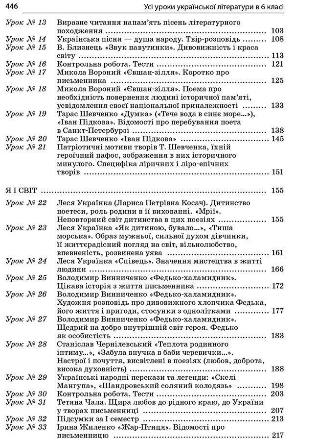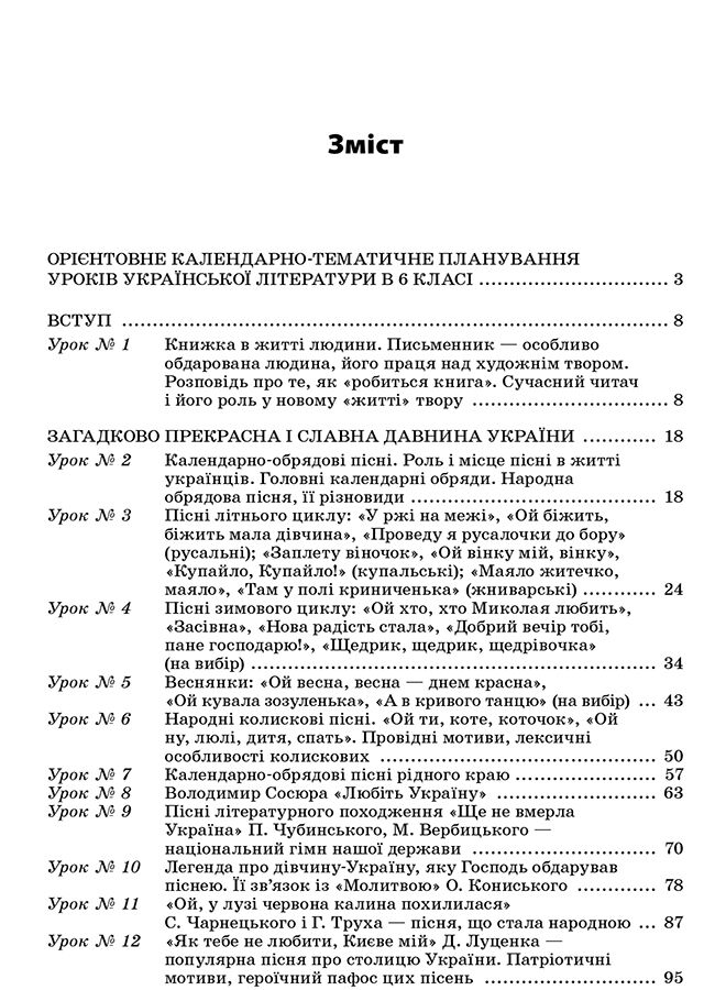 У посібнику вміщено уроки української літератури для 6 класу, які розроблено за новою програмою, затвердженою Міністерством освіти і науки України. Серед них уроки текстуального вивчення творів, позакласного читання, розвитку зв’язного мовлення, літератури рідного краю, тематичного оцінювання. Запропоновані розробки містять елементи нестандартних уроків, інтерактивних методик.