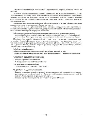 Посібник має на меті допомогти вчителям-філологам, які з 2025–2026 навчального року впроваджуватимуть модель НУШ у 8-му класі. Орієнтовне календарно-тематичне планування та матеріали до уроків складено за програмою «Українська література. 7–9 класи» для закладів загальної середньої освіти (автори: Т. О. Яценко, В. І. Пахаренко, О. А. Слижук, І. А. Тригуб). Видання містить матеріал для опрацювання, вправи для виконання, зокрема інтерактивні форми й т. ін., із-поміж яких учитель може вибирати те, що відповідає рівню навчальних досягнень певного класу тощо. Всі завдання відповідають групам результатів, відповідно до концепції НУШ.