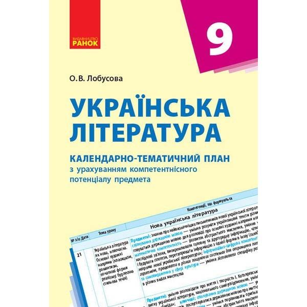 Календарно-тематичний план Українська література 9 клас Лобусова О. Ранок. Запропонований календарно-тематичний план розроблено у відповідності до програми для загальноосвітніх навчальних закладів "Українська література" 5-9 класи (затверджена Наказом Міністерства освітиі науки України) з урахуванням засадчих ідей особистісно зорієнтованого і компетентнісного підходів у навчанні.