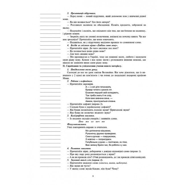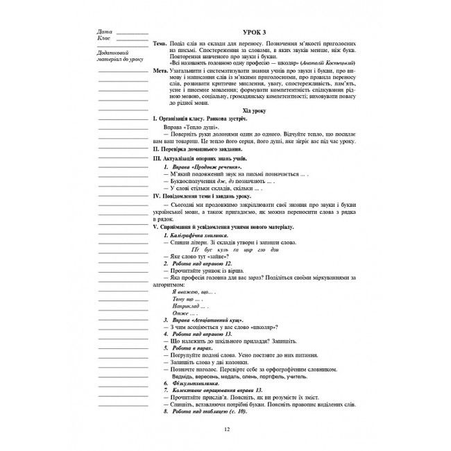 Українська мова 3 клас Конспекти уроків До підручника Варзацької Л. НУШ Богдан. У посібнику подано розгорнуті конспекти уроків з української мови, зміст яких відповідає Державному стандарту початкової освіти, Типовій навчальній програмі, розробленій під керівництвом О. Я. Савченко, та підручнику «Українська мова та читання. 3 клас. Ч. 1» (авт. Варзацька Л. О., Трохименко Т. О.). Запропоновано зразки бесід під час вивчення нового матеріалу, опорні схеми, таблиці, малюнки; різні види роботи над мовним матеріалом, правилами; каліграфічні хвилинки, творчі завдання, різноманітний цікавий та ігровий матеріал. Для вчителів початкових класів, студентів педагогічних навчальних закладів.