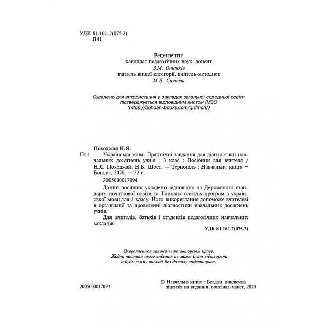 Українська мова 3 клас Практичні завдання для діагностики навчальних досягнень учнів Посібник для вчителя НУШ Богдан. Даний посібник укладено відповідно до Державного стандарту початкової освіти та Типових освітніх програм з української мови для 3 класу. Його використання допоможе вчителеві в організації та проведенні діагностики навчальних досягнень учнів.