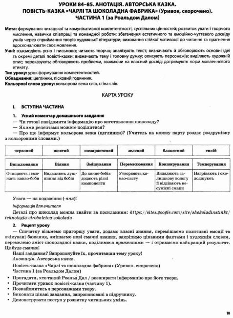 Конспекти уроків, різноманітних за формою проведення, побудовано з урахуванням основних положень Концепції «Нова українська школа», на засадах компетентнісного, діяльнісного підходів, з використанням елементів інтеграції, інноваційних та здоров’язбережувальних технологій, інтерактивних методів та прийомів навчання, сучасного обладнання як складової нового освітнього середовища.