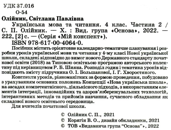 Мій конспект Українська мова та читання 4 клас Частина 2 За підручнком О. Большакової НУШ Основа. Посібник містить орієнтовне календарно-тематичне планування і розробки уроків української мови та читання у 4-му класі Нової української школи, складені відповідно до вимог нового Державного стандарту початкової освіти (2018) за Типовою освітньою програмою авторського колективу під керівництвом Р. Б. Шияна. Розподіл годин і тематика уроків відповідають змісту підручника О. І. Большакової, І. Г. Хворостяного (Українська мова та читання : підруч. для 4 кл. закл. загал. серед. освіти (у 2-х ч.) : Ч. 2.— Х. : Вид-во «Ранок», 2021).