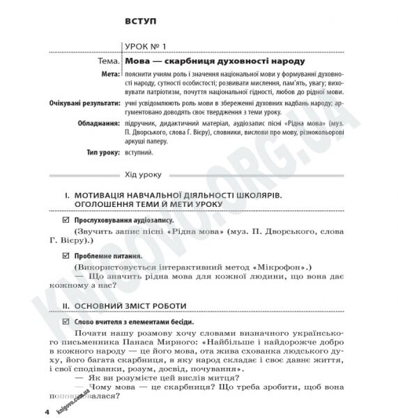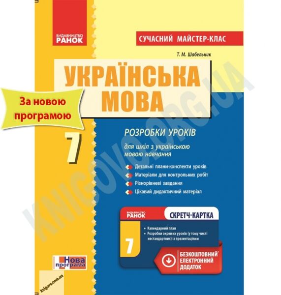 Посібник містить детальні розробки уроків з української мови для 7-го класу. Видання укладено відповідно до вимог чинної програми. У посібнику подано детальні розробки 88 уроків, включаючи уроки розвитку зв’язного мовлення, контрольні роботи. Враховано вік семикласників; учитель знайде в книжці багато цікавих завдань, застосування інтерактивних методик, ігрових форм. Деякий теоретичний матеріал подано у формі таблиць. Обсяг текстів та зміст тестових завдань відповідає програмовим вимогам. До посібника додається скретч-картка для завантаження безкоштовного електронного додатка: календарного плану та розробок уроків із презентаціями. Призначено для вчителів української мови та студентів філологічних факультетів.