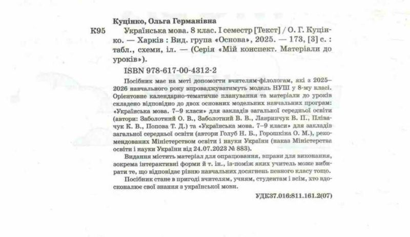 Мій конспект Матеріали до уроків Українська мова 8 клас I семестр НУШ Авт: О.Г. Куцінко Вид-во: Основа 110368