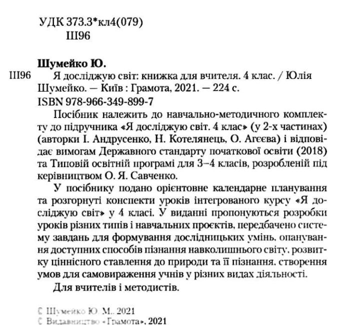 Книжка для вчителя Я досліджую світ 4 клас НУШ Авт: Шумейко Ю. Вид-во: Грамота 65764