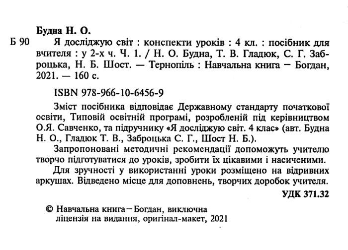 Нова українська школа Я досліджую світ 4 клас Конспекти уроків Частина 1 До підр. Будна Н. НУШ Богдан. Зміст посібника відповідає Державному стандарту початкової освіти, Типовій освітній програмі, розробленій під керівництвом О.Я. Савченко, та підручнику «Я досліджую світ. 4 клас» (авт. Будна Н. О., Гладюк Т. В., Заброцька С. Г., Шост Н. Б.).