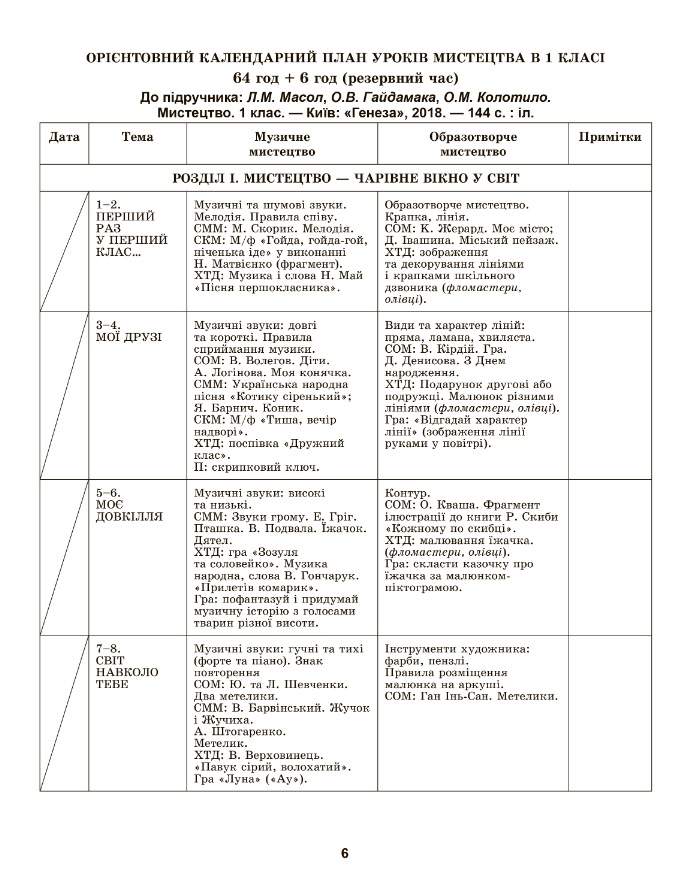 Конспект-конструктор уроків мистецтва Мистецтво 1 клас НУШ Масол Л. Генеза.