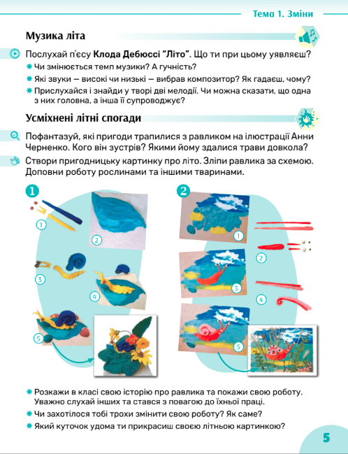 Підручник інтегрованого курсу “Мистецтво” для 2 класу відкриває для дітей самобутні й колоритні українські та зарубіжні твори живопису, музичного, театрального та інших видів мистецтва. Цей підручник допоможе вашим учням навчитися помічати красу довкола, мислити творчо, самовиражатися та працювати в команді. Підручник містить матеріали для досягнення учнями обов’язкових результатів навчання з мистецької освітньої галузі, визначених Державним стандартом початкової освіти, і відповідає Типовій освітній програмі НУШ-1 та Типовій освітній програмі НУШ-2.