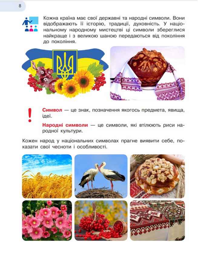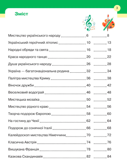 Підручник узагальнює та уточнює набуті протягом попередніх років знання щодо вітчизняної культури, національних особливостей народного мистецтва України, знайомить учнів/учениць із мистецькими традиціями різних народів (країн Європи, Кавказу, Азії, Америки, Африки).