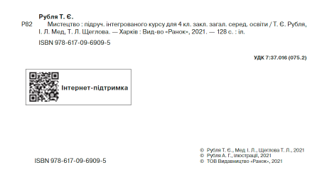 Підручник Мистецтво 4 клас НУШ Рубля Т. Мед І. Щеглова Т. Ранок. Підручник укладено за Типовою освітньою програмою інтегрованого курсу «Мистецтво», розробленою під керівництвом О. Я. Савченко для 4 класу.