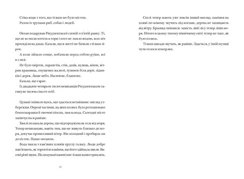 \nЯк японці долають утрати і травми, як проживають катастрофи, що знищують цілі поселення або ж перетворюють їх у місця, непридатні для життя; як ставляться до смерті і про що воліють більше мовчати, ніж говорити, — саме цим темам присвячено книжку.