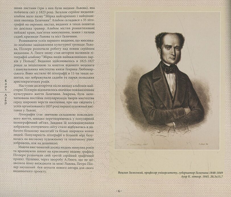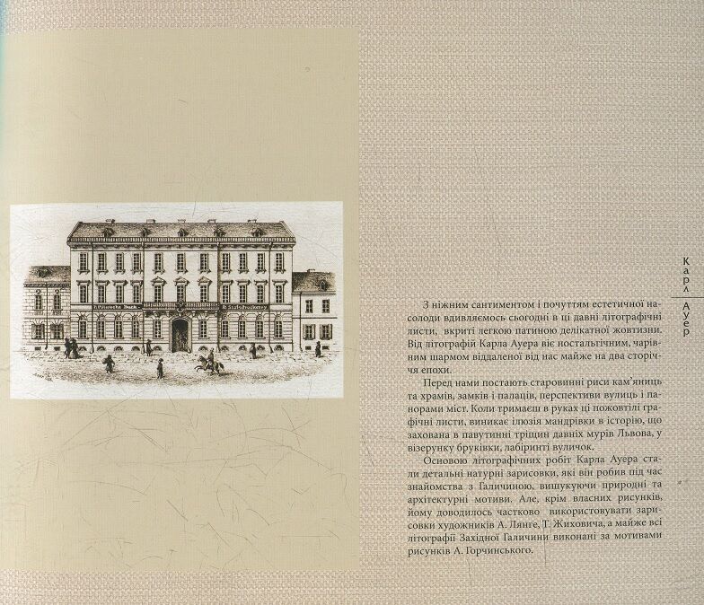 Книга присвячена творчому доробку львівського художника-графіка, чеха за походженням Карла Ауера (бл.1818–1859). Його роботи – це своєрідна літографічна ода давньому Львову, містам і селам Галичини, її чарівній природі та людям. Велична архітектура, мальовничі пейзажі переносять глядача у сиву давнину, відтворюють флер романтичної старовини. Саме майстерність К. Ауера передати наступним поколінням дихання часу, атмосферу місця і навіть настрій стала відмінною рисою його робіт і зробила їх унікальними. Книга призначена широкому колу читачів та шанувальникам мистецтва.