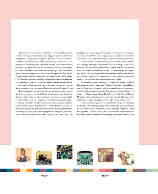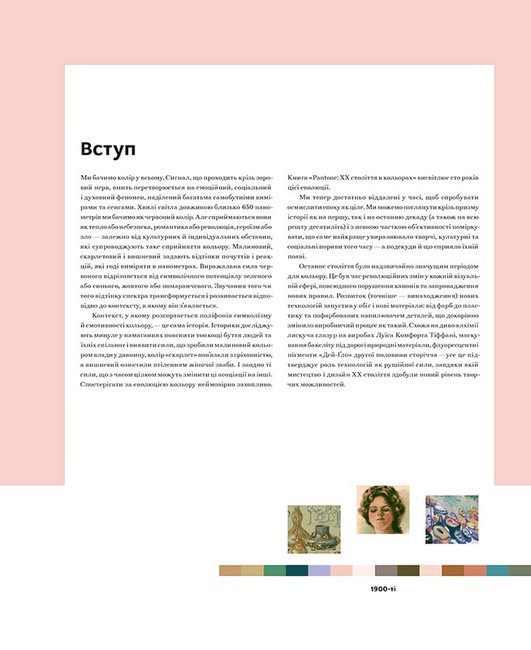 Уперше: історія XX століття в кольорах Pantone — всесвітній законодавець у царині кольору — запрошує до візуальної мандрівки сотнею багатих на трансформації років. Для цієї книги досвідчені працівники Pantone і знавці кольору Ліатріс Айзмен та Кіт Рекер обрали понад 200 іконічних творів мистецтва, виробів, предметів декору й моди, що унаочнюють палітри, які складали візуальний образ кожного окремого десятиліття. Це яскраве видання описує соціальні перипетії нещодавньої історії в таких словах і відтінках, які пропонує тільки Pantone. Це беззаперечний помічник для всіх, хто прагне поглибити своє розуміння кольору.
