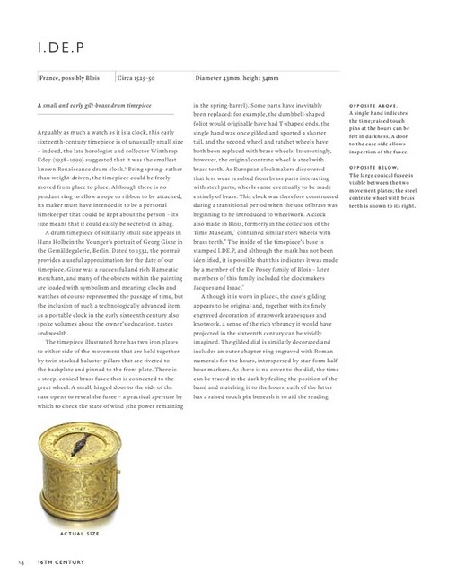 Століттями людей захоплювали годинники — чи то технічною точністю, унікальним дизайном чи історичною важливістю. Кожен із ста годинників, описаних у цій елегантній книзі, вирізняється однією чи кількома з цих якостей. Організовані в хронологічному порядку та поділені за століттями, годинники представлені на просторих двосторінкових розворотах, які містять вишукані фотографії з привабливими, проникливими текстами. Читачі відкриють приклади найдавніших форм годинника; дивовижний годинник епохи Єлизавети з астролябічним циферблатом; годинник початку 17 століття, укладений в єдиний смарагд; два найперші годинники з пружиною балансу — функція, яка революціонізувала портативний хронометр; і деякі з перших годинників із повторюваним і вічним календарем. За ними слідують перші важільні годинники, винайдені Томасом Маджем; важливі точні годинники; годинник з емаллю та автоматом початку 19 століття; високоскладні годинники Breguet і Patek Philippe; Годинник World Time Victory з жовтого золота сера Вінстона Черчилля; наручний годинник Rolex, виготовлений на честь Дня Республіки Індії; Omega Speedmaster, що полетіла в космос; і наручний годинник Роджера Сміта, завершений у 2023 році. Ця історична колекція, що містить вишукано відтворені фотографії, які вперше з’явилися разом у формі книги, сподобається досвідченим колекціонерам, аматорам годинників і всім, хто цікавиться мистецтвом і наукою годинникарства. .