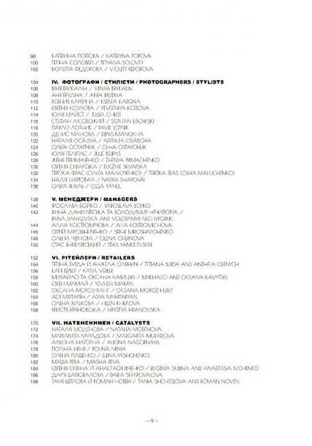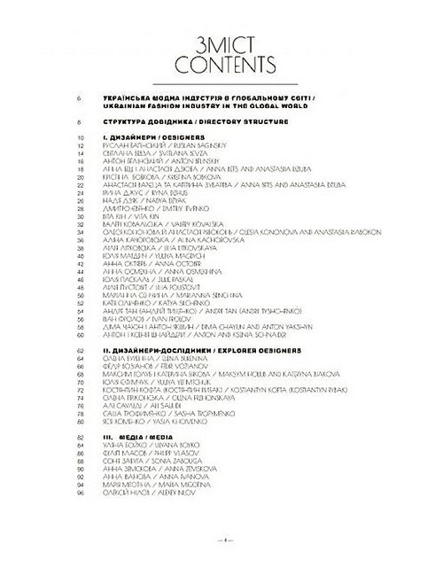 Книга «Fashion Directory of Ukraine» репрезентує сучасний стан моди України та становлення вітчизняної модної індустрії. Це перше видання, що пропонує загальну картину галузі й водночас є джерелом довідникової інформації щодо її ключових учасників. На сторінках довідника зібрано інформацію про найкращих представників усіх складових індустрії: дизайнерів, стилістів, fashion-фотографів, редакторів модних часописів, топ-менеджерів та рітейлерів. «Портрет» кожного з героїв складається з інформативного тексту, зробленого на основі особистого інтерв’ю, довідки з переліком головних кар’єрних досягнень, а також фото найкращих зразків творчості. Усю інформацію подано двома мовами: українською та англійською.