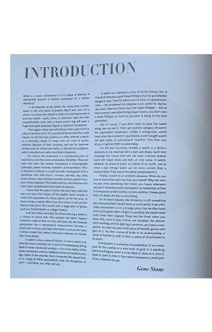 Від Patek Philippe і Rolex до Seiko і Swatch, і охоплюючи п'ятдесят брендів, ця книга містить важливу інформацію про те, як купувати, колекціонувати і доглядати за цими годинниками. Текст ілюструють понад 500 фотографій чоловічих годинників, включаючи чудові деталі циферблатів і механізмів, відібраних за їхню красу і різноманітність з колекцій по всьому світу.