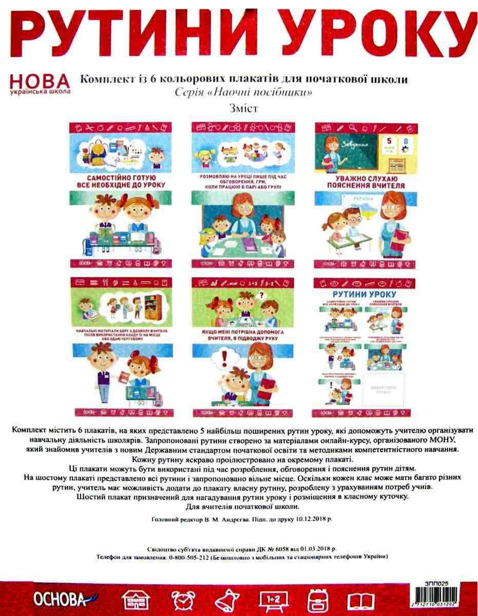 Комплект плакатів Рутини уроку НУШ. Комплект містить 6 кольорових плакатів для початкової школи, на яких представлено 5 найбільш поширених рутин уроку, які допоможуть учителю організувати навчальну діяльність школярів. Запропоновані рутини створено за матеріалами онлайн-курсу, організованого МОНУ, який знайомив учителів з новим Державним старндартом початкової освіти та методиками комптентністного навчання.