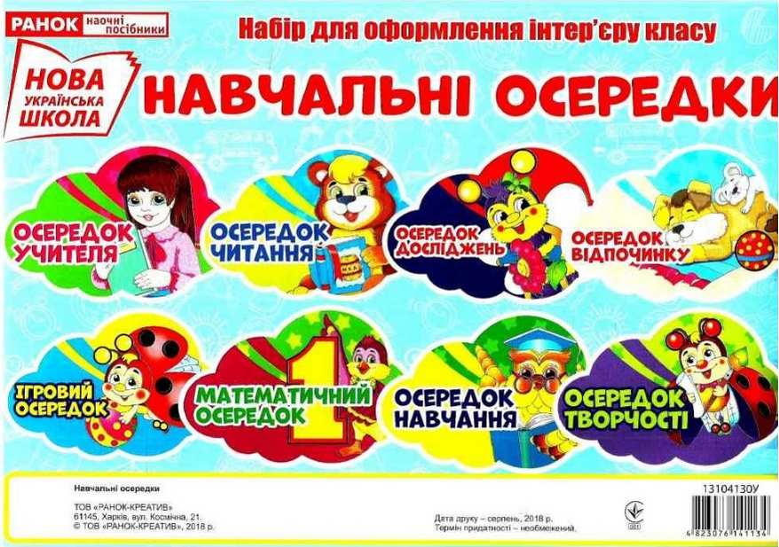 Набір для оформлення інтер'єру класу Навчальні осередки НУШ Нова українська школа. У наборі 8 осередків, розмір 30х20,5 см. Учителя, читання, досліджень, відпочинку, ігровий, математичний, навчання, творчості.