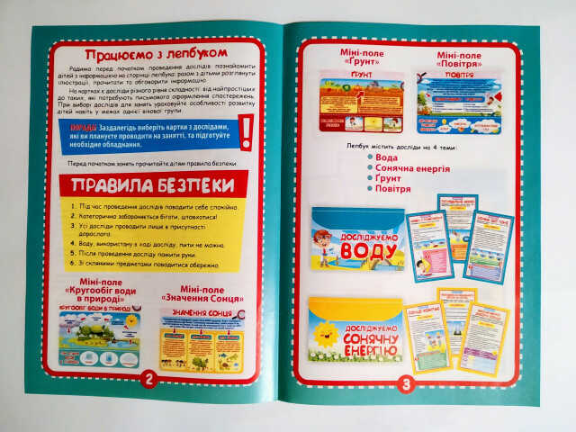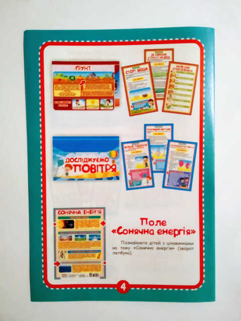 Педагоги та психологи запевняють, що дослідницька діяльність має важливе значення для розвитку пізнавальних здібностей дітей. Адже, дослід дає дітям можливість побачити різноманітні процеси, усвідомити властивості природних об’єктів, зрозуміти сутність природних явищ. Цей посібник містить картки з цікавими дослідами, які розкривають секрети води, сонячної енергії, ґрунту та повітря.