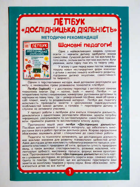 Це універсальний посібник, який об’єднав у собі плакат, книгу та роздавальний матеріал. Лепбук дає можливість педагогу проводити заняття з урахуванням індивідуальних особливостей кожної дитини, а головне – перетворити дитину із слухача на активного учасника. Використовуючи лепбук під час занять, вчимо дітей планувати, домовлятися з однолітками, розподіляти обов’язки, самостійно шукати потрібну інформацію, пояснювати, приймати рішення та висловлювати власну думку.