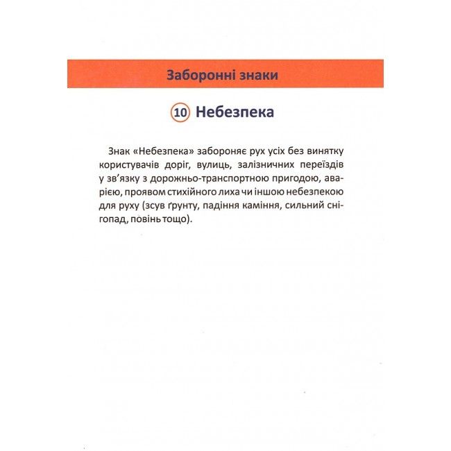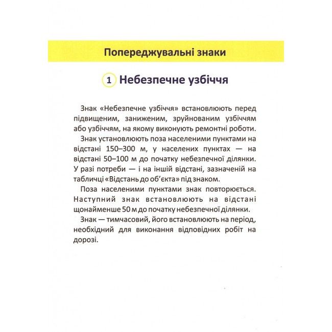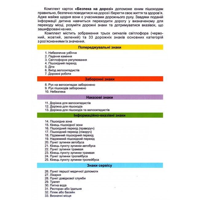Комплект містить зображення трьох сигналів світлофора (червоний, жовтий, зелений) та 33 основні дорожні знаки з роз’ясненнями їх значення.