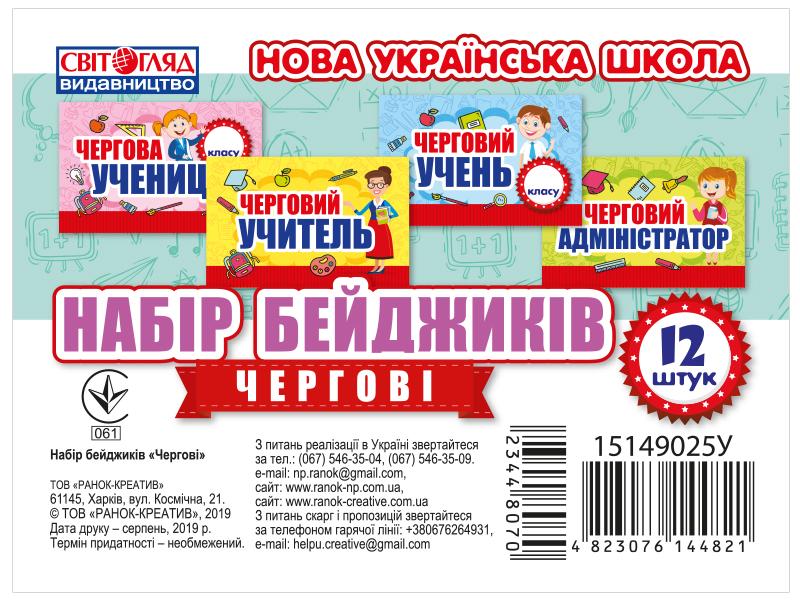 НУШ Набір бейджиків Чергові Світогляд Ранок. Чергова учениця, Черговий учень, Черговий учитель та інше.