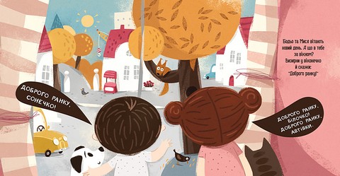 Бодьо та Мися радiсно розпочинають день. Дiти вiтаються iз сонцем, iз бiлкою, яку помiтили за вiкном, i навiть з автiвками на вулицi. Потiм вони чистять зубки, одягаються та снiдають. Не забувають також погодувати песика й кицю. I в усьому їм допомагають маленькi читачi та читачки.
