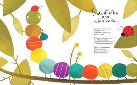 «Босоніжки для стоніжки» мають ще одну «родзинку»: художниця залишила читачам простір для співтворчості, отож вони зможуть розмалювати і взуття для стоніжки, і листя на дереві й веселих