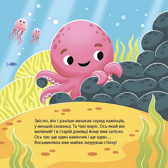 Восьминіжка Чакі переживає різні емоції. Він радіє, сумує, злиться, дивується, боїться. Знайомиться зі своїми почуттями й намагається керувати ними. Разом із Чакі маленькі читачі також дізнаватимуться про різні емоції та вчитимуться приймати їх і давати собі раду.