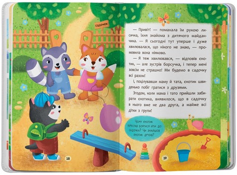 Ваше маля скоро піде до дитячого садочка? Потрапляючи в незнайому обстановку, дитина зазвичай відчуває сильний стрес. Тож завдання дорослих — зробити відвідування дитячого садка приємним та комфортним. Це видання стане незамінним помічником у вихованні малюка, а милі герої на своєму прикладі покажуть, що в дитячому садку зовсім не страшно, а весело та цікаво. Книга допоможе дитині налагодити спілкування з однолітками та швидко й екологічно адаптуватися до дитячого садка.