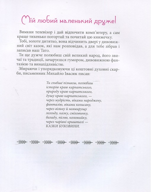 Буковинські казки записав та літературно опрацював відомий український письменник Михайло Івасюк. Вони подарують приємне знайомство з відважними й мудрими героями, котрі в пошуках щастя перемагають неправду та лихо, зазнають ліпшої долі, стають багатшими на душевні почуття й помисли.