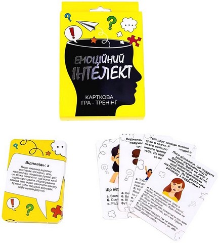 «Емоційний інтелект» – це карткова гра з цікавими питаннями і варіантами відповіді. Кожна картка унікальна і описує ситуацію, яка може виникнути в житті дитини. Відповівши на картку, ви можете прочитати на звороті пояснення правильного варіанту. Можете грати наодинці, перевіряючи себе, а можете грати в команді, прислуховуючись до думки одне одного.